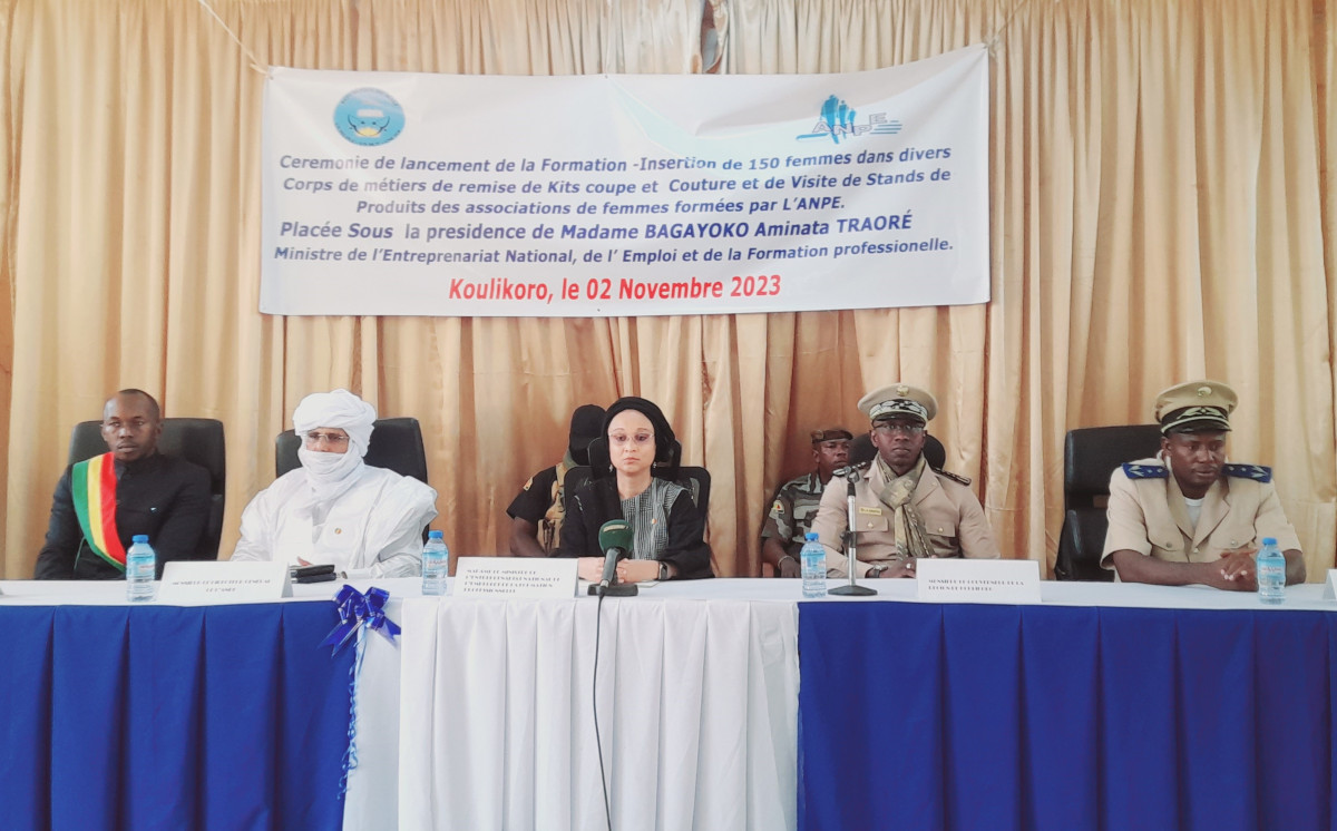 Lancement ce jeudi 2 novembre 2023 à Koulikoro de la formation et l’insertion de 150 femmes par l’Agence nationale pour l’emploi (ANPE). L’objectif est de renforcer les capacités des femmes dans divers corps de métier en vue d’améliorer leurs conditions de travail et d’insertion sociale. L’activité a été couplée à la remise de kits et matériels de couture à des associations de femmes qui avaient suivi une précédente formation. La cérémonie a été présidée par le ministre de l’Entrepreneuriat national et de la Formation professionnelle.